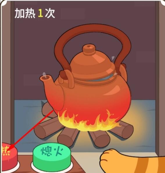 这一关要求点击七次加热将水烧开,但是按到第六次的时候会有一只猫爪向左推了一下开关,此时停顿一下,不要误按了熄火,之后在按一次加热即可过关!
