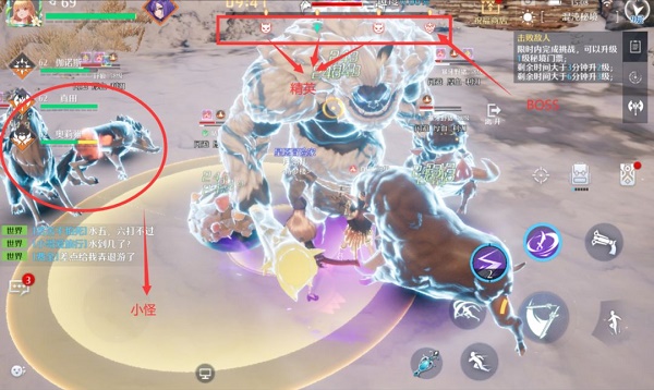 1.进入战斗后,从进度条上可以看出整场战斗中,与精英怪和小怪的交战时间最久,因此在攻击类属性中,增伤的优先级为: