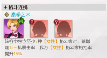 她的定位前排型辅助,格斗连携可以为自己带来15%的抗暴率,为全体女性队友给到15%的格挡率加持。在全明星激斗里面“格挡”等于完全将这次伤害消弭。所以,增加格挡率的效果还是很香的,配合一些其他本身就有格挡率的角色,譬如琼自己,以及麻宫,可以给后排带来出色的生存空间。