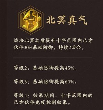 北冥真气乃是玄武的战斗能量。此天相效果是在战法-北冥之盾的基础上进行,触发时会提升十字范围内己方伙伴的基础防御,持续2回合。