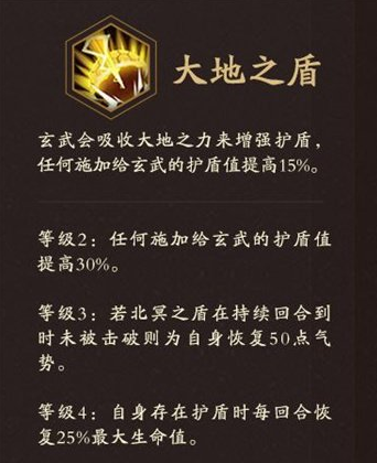 吾盾之坚,物莫能陷也!玄武使用该天相效果,会吸收大地之力来增强护盾,任何施加给玄武的护盾值提高一定的概率。