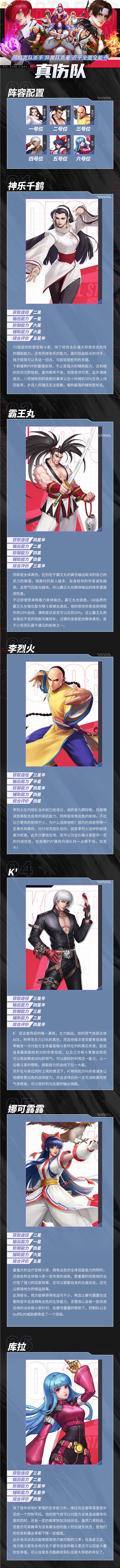 该套阵容的常规配置是三位前排:神乐千鹤、霸王丸、李烈火以及三位后排;以及三位后排:K’、娜可露露以及库拉。总体上这属于一套中后期十分强势强势PVP阵容,在特定的PVE阵容战中也有出色的表现,在前期也是也有不错的战斗能力,只是该套阵容不够灵活,每一个格斗家都是刚需,不存在合适的下位替代,练度也有较高的需求。
