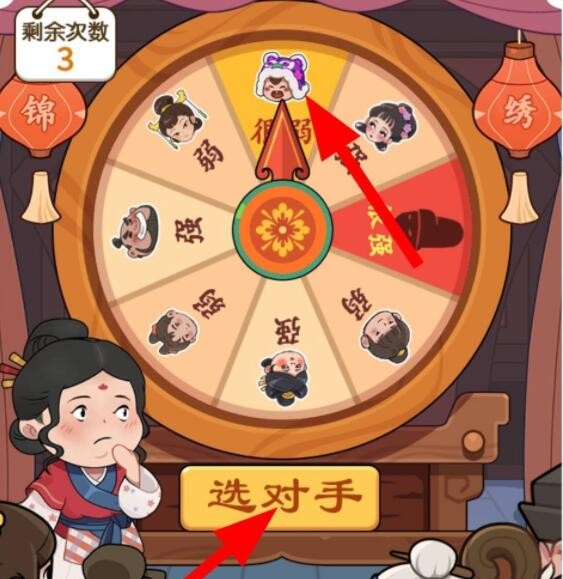 1、点击转盘下面的选对手按钮开启转盘,当转盘停止后,迅速按住转盘上唯一一名【很弱】的选手并把他拖动到指针对准的位置,即可抽到最弱的对手。