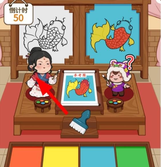 2、给锦里刺绣上色,背景是蓝色,尾巴是黄色,身体是红色,头部的颜色并不在颜料格里,而是需要我们点击范团的衣服,提取范团衣服上的颜色画到鱼头位置。