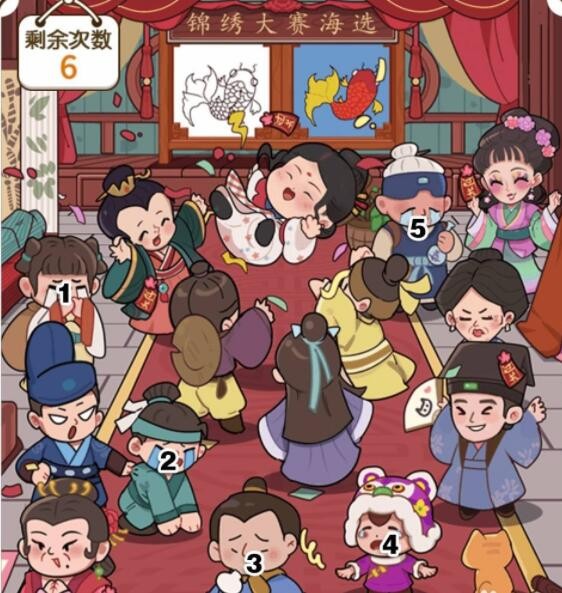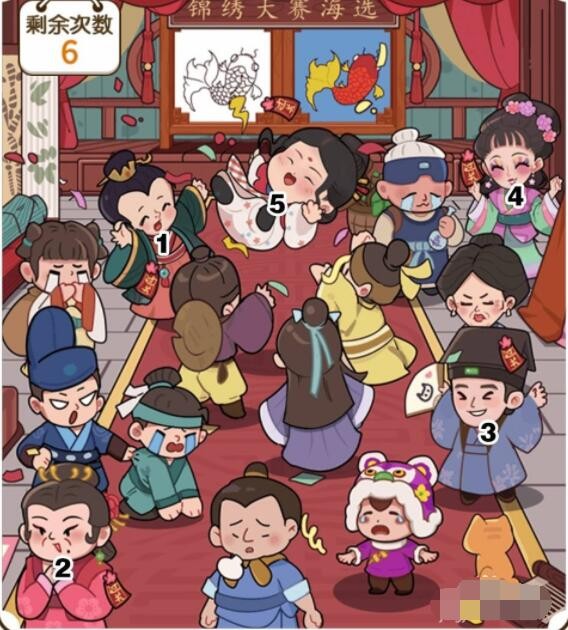 3、按照已经标注到图中的数字记号,将5个淘汰出局的人找到。