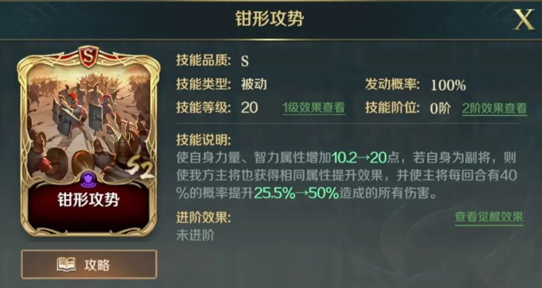 【钳形攻势】在游戏中是一个增加自身属性、并为主将施加增益的被动技能,尤其每回合有40%概率为主将提高50%伤害,能够让主将伤害大幅度增加,极大程度上加强了战斗能力。具体效果如下:
