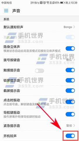 2)接着找到【开机铃声】选项,然后把它右边的开关关闭,这样就不会再响起开机铃声了。(如下图)