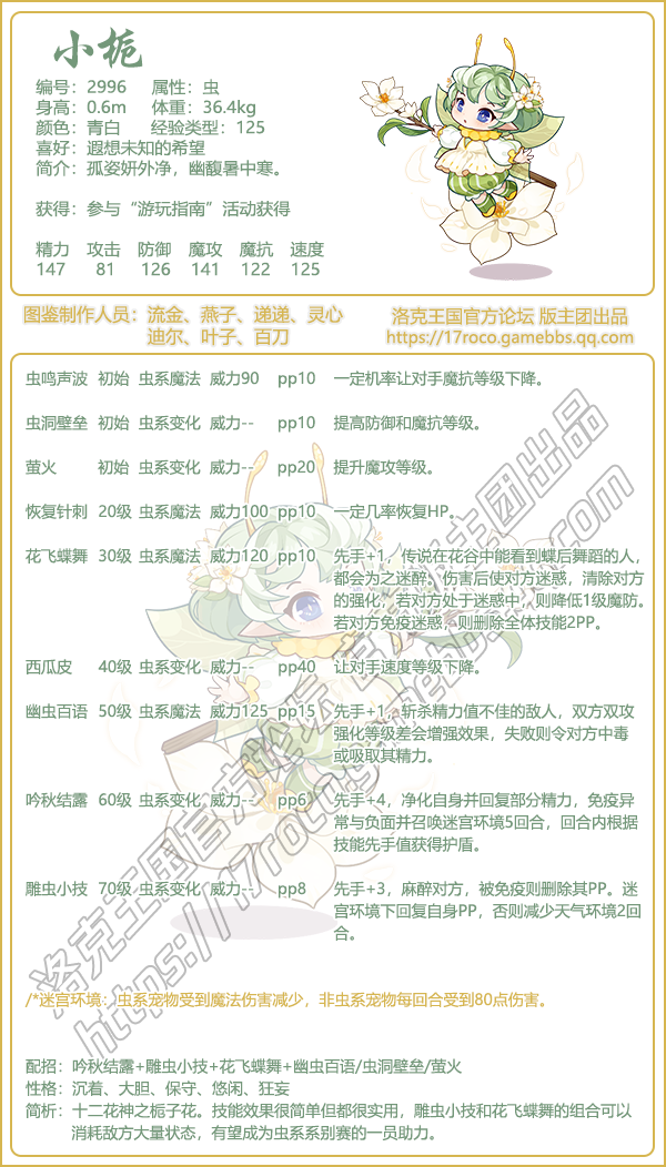 简析:十二花神之栀子花。技能效果很简单但都很实用,雕虫小技和花飞蝶舞的组合可以消耗敌方大量状态,有望成为虫系系别赛的一员助力。