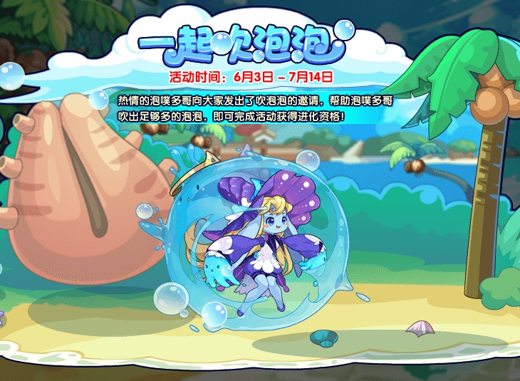 热情的泡噗多哥向大家发出了吹泡泡的邀请,帮助泡噗多哥吹出足够多的泡泡,即可完成活动获得进化资格!