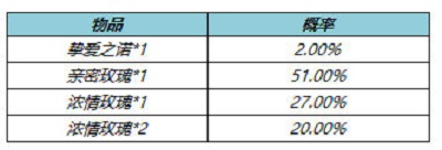 1、购买红蓝对决(1日),可额外随机获得以下之一:挚爱之诺*1、亲密玫瑰*1、浓情玫瑰*1、浓情玫瑰*2。累计20次至少可获得挚爱之诺*1。