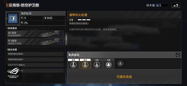 5.装甲方面我们加点选择:物理抗性提升+附加装甲。这样加点的话是比较常规的,在大多数情况都可以使用,可以极大的提升该战舰的生存空间,假设对方有较多的能量型武器,例如维塔斯这种能量型的轰炸机的话,我们可以将其中的一个附加装甲替换成能量抗性提升。