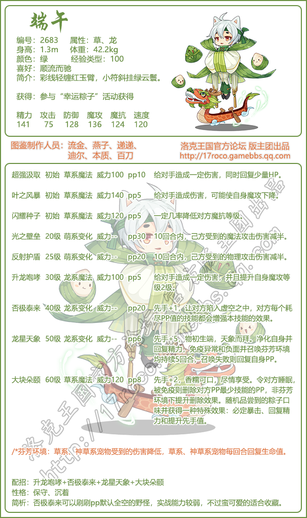 洛克王国游戏中有许多宠物精灵,很多玩家想知道【端午】技能怎么搭配?对此,游戏爱好者小编特意为大家准备了这边详细的内容攻略,让我们一起来看看吧!