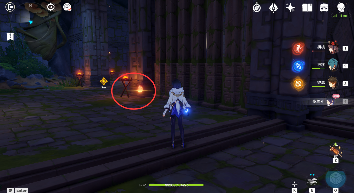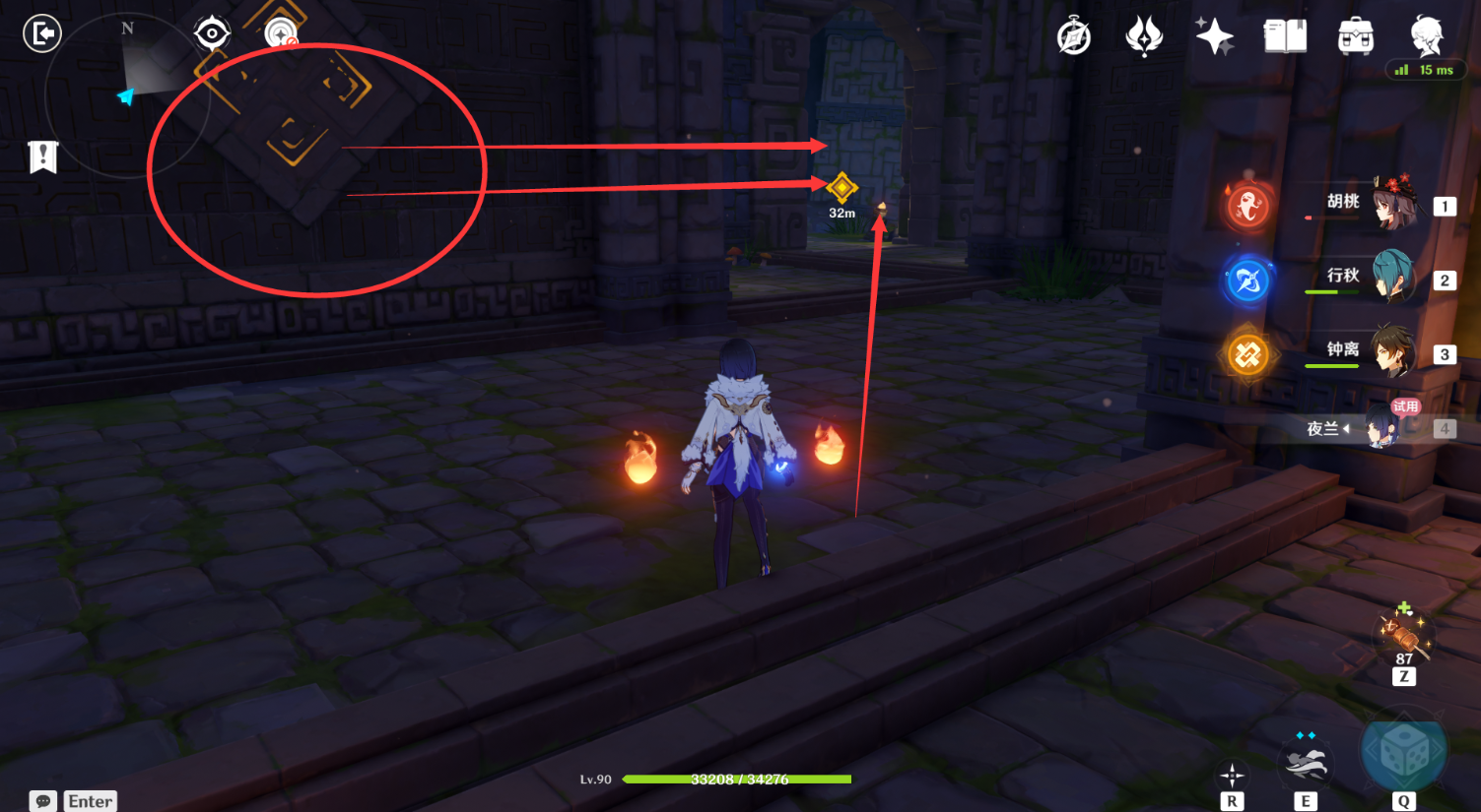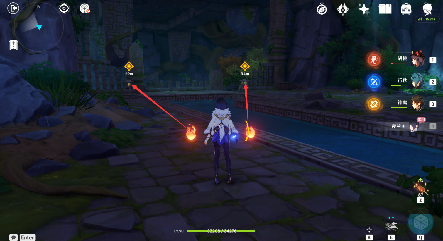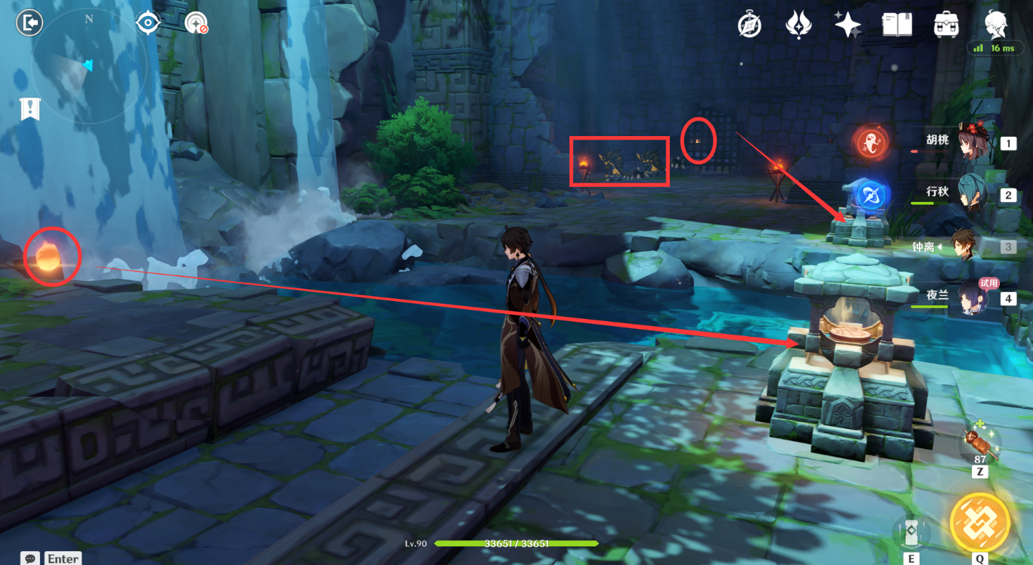 连续开两扇门后,可以看到火深渊法师和丘丘人,击败它们后往右走。