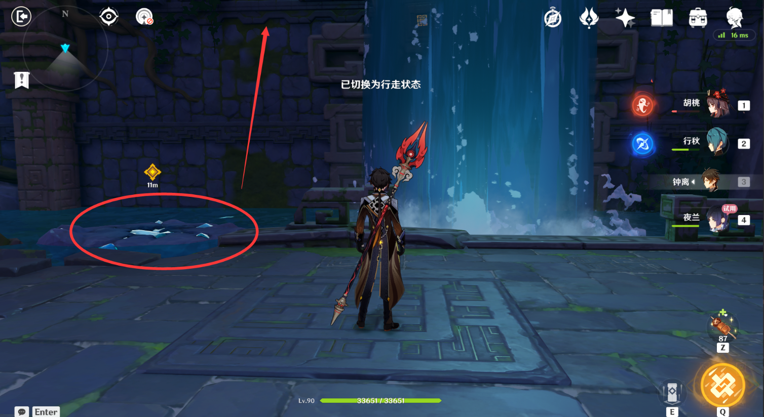 ④进入水下入口后,使用上升石板机关可以来到下个空间,这里可以看到右侧有两个需要解密的机关,左侧有一些丘丘人。击败丘丘人后进入左侧遗迹空间。