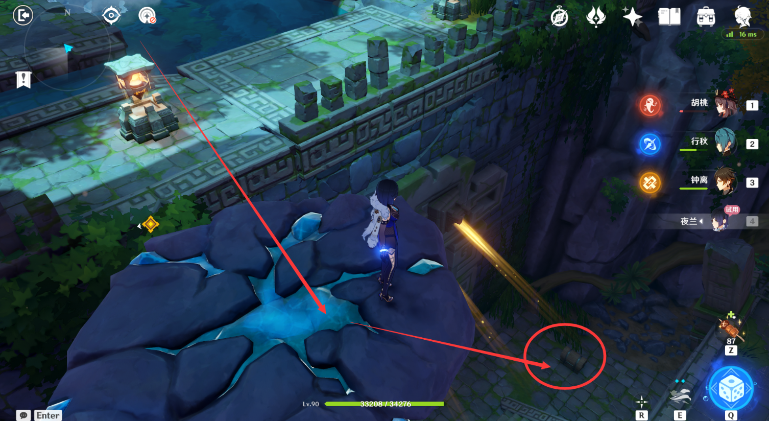 ②先不要着急去水下入口,完成解密后,从我们上来的这个石板机关下方,之前的水退了,可以拾取到一个普通的宝箱,这是箱子③。