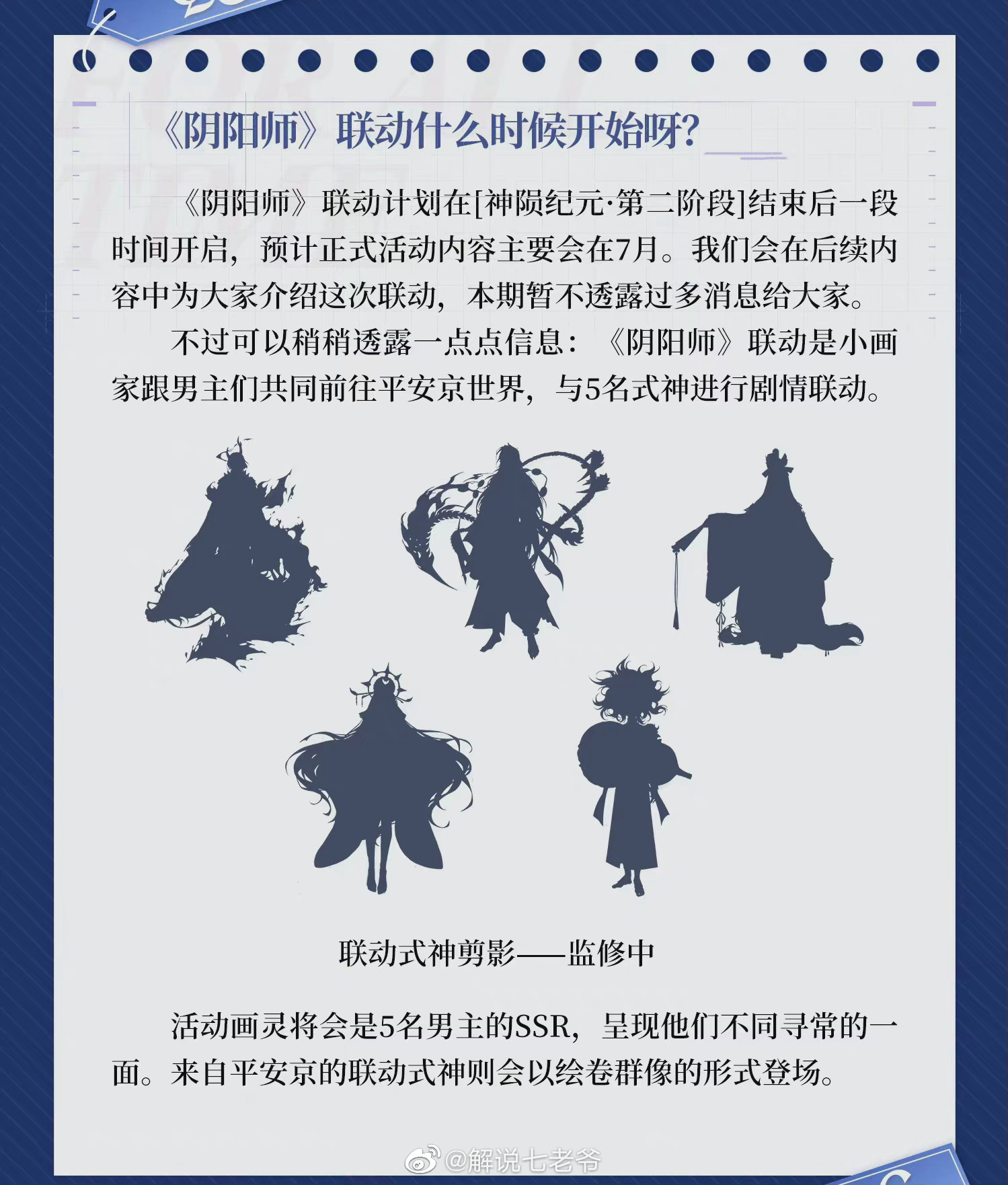 《阴阳师》联动计划在[神陨纪元第二阶段]结束后一段时间开启,预计正式活动内容主要会在7月。我们会在后续内容中为大家介绍这次联动,本期暂不透露过多消息给大家。