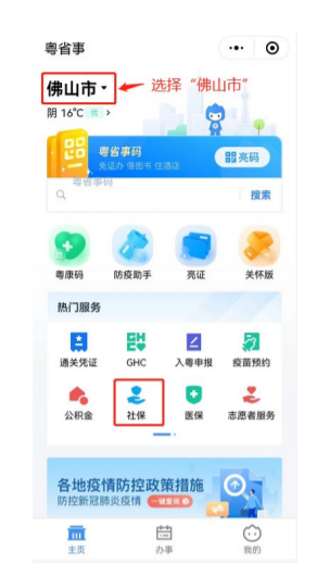 1、打开并登录粤省事小程序,切换自己的城市,点击【热门服务】-【社保】进入社保业务大厅