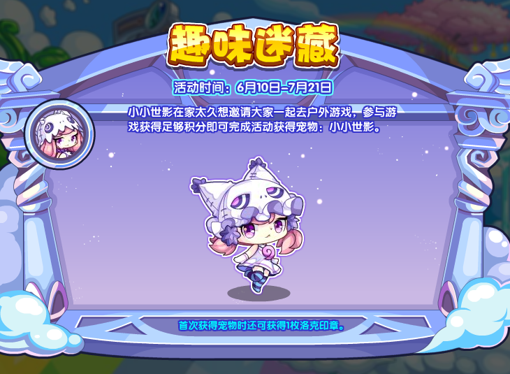 小小世影在家太久想邀请大家一起去户外游戏,参与游戏获得足够积分即可完成活动获得宠物:小小世影。
