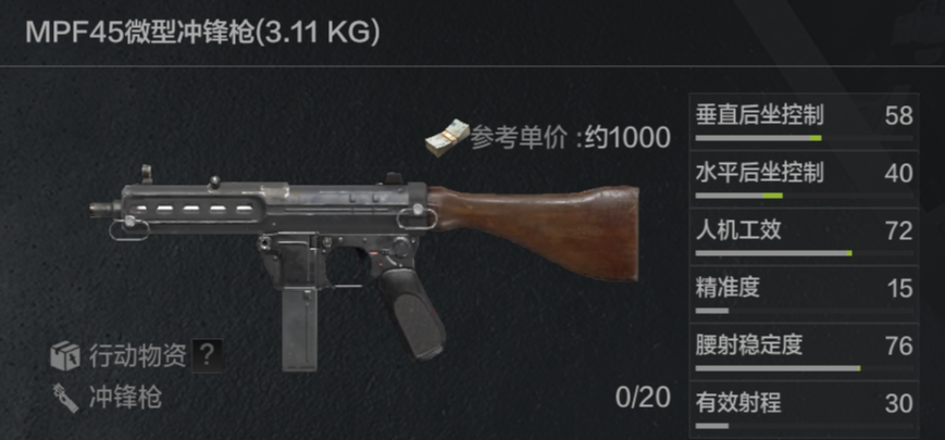 MPF45是一把使用.45口径子弹的入门级冲锋枪,后坐控制、精准度都比较低,不过76的腰射稳定度和700的射速还算不错。