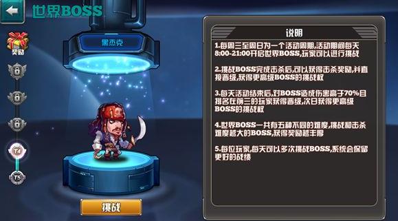 查看每日伤害排行。可以查看自己的伤害排行,如果能够造成boss血量70%以上的伤害,并且达到前三名即可直接获得下一难度世界boss的挑战权。下图为详细规则说明。每周三到周日都可以进行挑战,伤害较高的玩家和直接击杀世界BOSS的玩家,都可以直接获得更高级世界BOSS的挑战权,每天都晋级的话,周日就可以挑战最高难度boss。世界boss等级越高奖励越丰厚。挑战T4难度的boss,最高可以获得300钻石、30魔龙币,奖励会通过邮件发送到玩家邮箱当中。