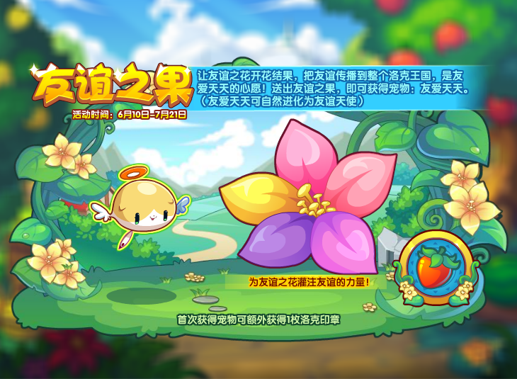 让友谊之花开花结果,把友谊传播到整个洛克王国,是友爱天天的心愿!送出友谊之果,即可获得宠物:友爱天天。