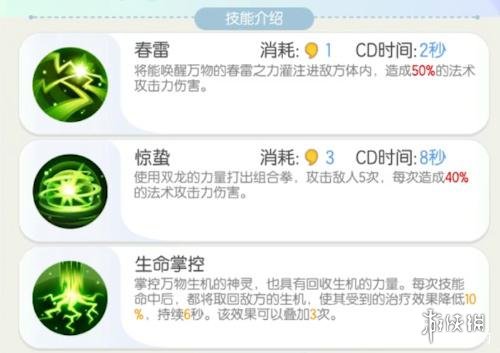 毒雷:将春雷之力灌入敌人体内,造成50%的法术伤害。消耗1豆,CD2秒
