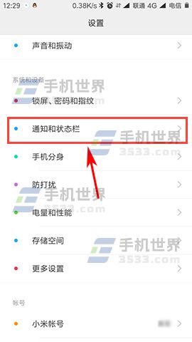 1)先打开手机的【设置】,进入设置菜单后继续点击【通知和状态栏】选项。(如下图)