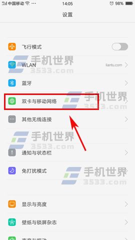 1)先打开手机的【设置】,进入设置菜单后再点击【双卡与移动网络】选项。(如下图)