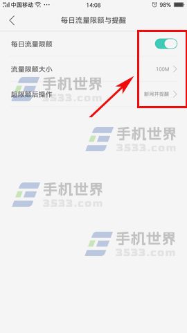 2)接着点击【每日流量限额与提醒】,最后开启开关,并且设置好【流量限额大小】以及【超限额后操作】就行了。(如下图)