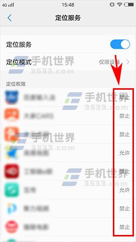2)接着就能看到【定位权限】了,想要对应用的权限进行修改只要点击对应的应用名称,再选择【禁止】或者【允许】就行了。(如下图)