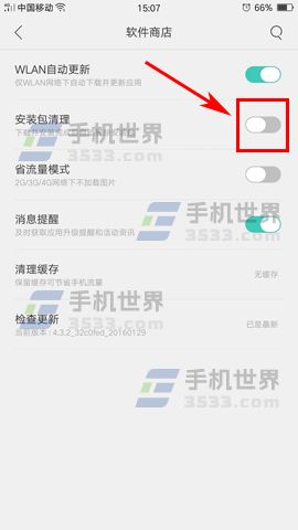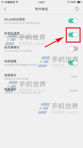 2)进入软件商店界面后再把【安装包清理】选项的开关打开,这样系统就会在应用安装完成后自动删除安装包。(如下图)