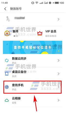 2)进入魅族账号界面后先登录自己的魅族账号,登录成功后点击【查找手机】,最后把【查找手机】右边的开关打开就行了。(如下图)