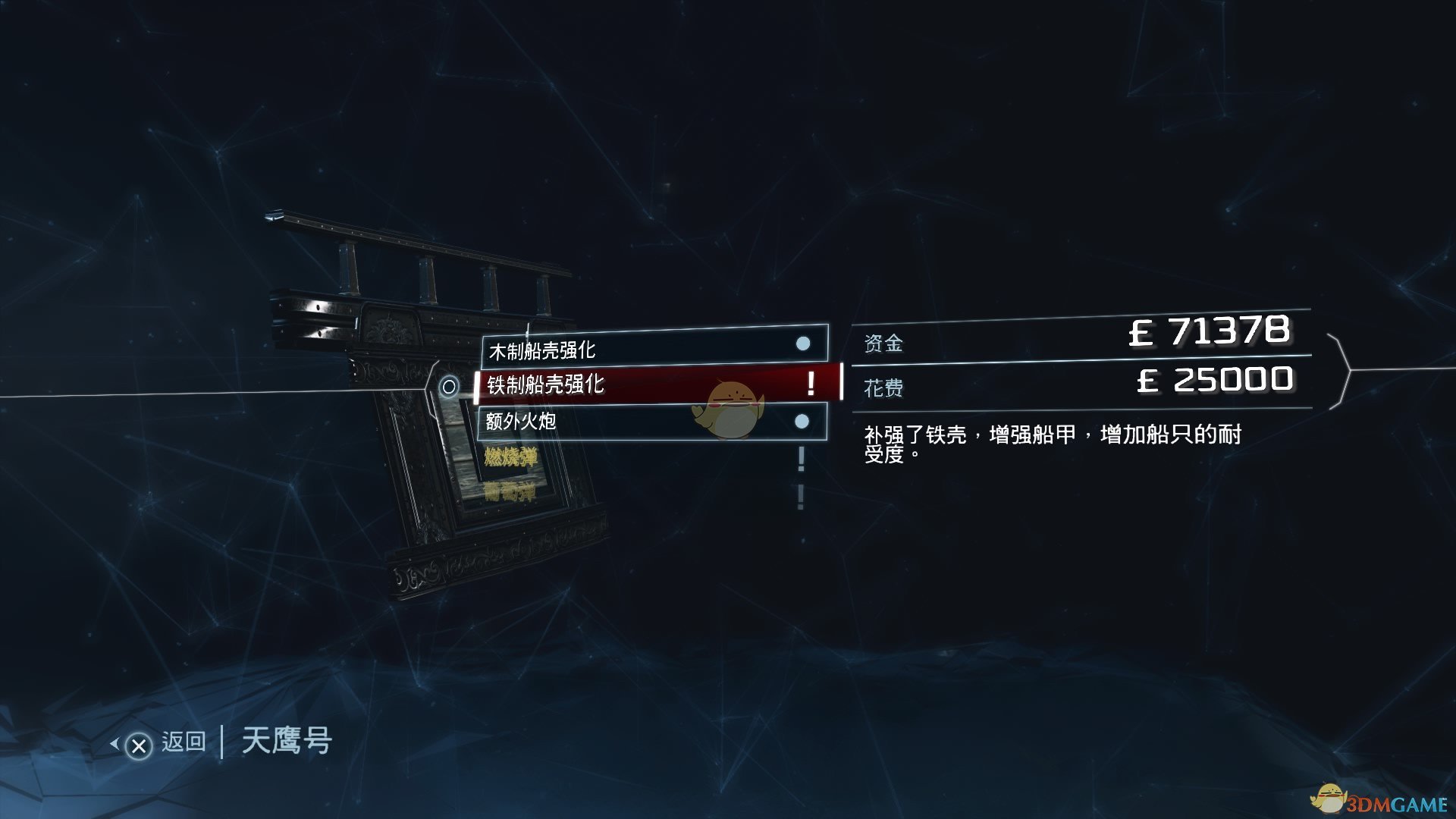 答案是升级天鹰号。天鹰号的升级项目都是只需要出钱就可以购买的,不需要其他资源。完全升级的天鹰号的综合战斗力可以说是有质的飞跃,在之后做海军任务、私掠者契约的时候我们会轻松很多。