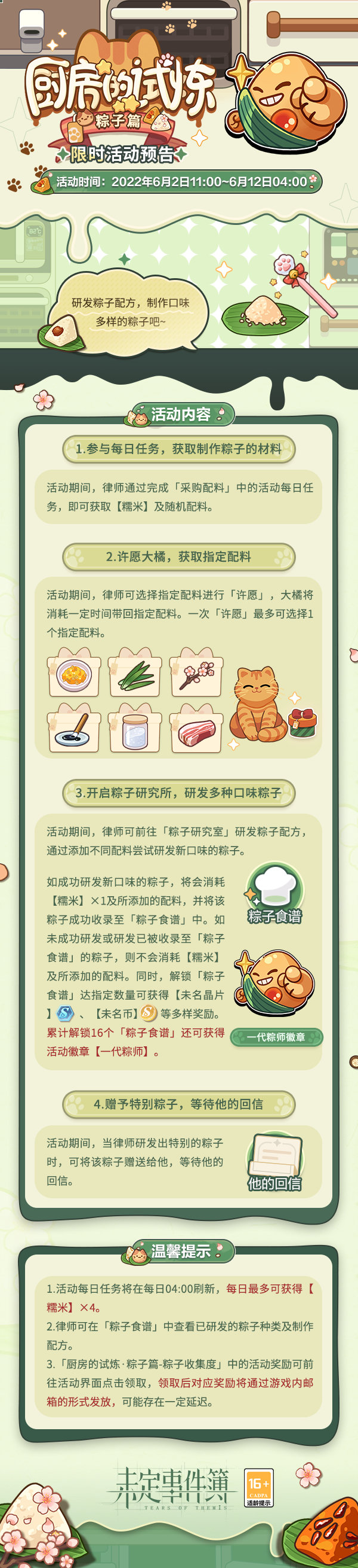 如成功研发新口味的粽子,将会消耗【糯米】×1及所添加的配料,并将该粽子成功收录至「粽子食谱」中。如未成功研发或研发已被收录至「粽子食谱」的粽子,则不会消耗【糯米】及所添加的配料。同时,解锁「粽子食谱」达指定数量可获得【未名晶片】、【未名币】等多样奖励。累计解锁16个「粽子食谱」还可获得活动徽章【一代粽师】