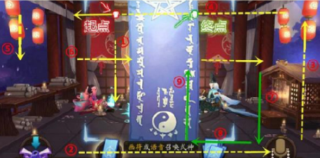 1.先从起点位置开始画,线路是垂直向下(顺着箭头走) ;到了底线后向右拐,一直横着往右画(跟着箭头走),到神龛的木腿,然后转向往上拐;