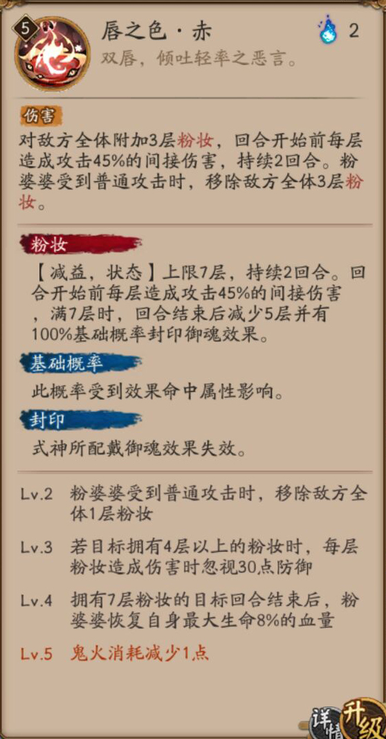 对敌方全体附加3层粉妆,回合开始前每层造成攻击45%的间接伤害,持续2回合。粉婆婆受到普通攻击时,移除敌方全体3层粉妆。