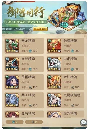 活动期间内,参与日常活动,有机会获得【御兽令】和【珍贵御兽令】,可在圣兽商域中兑换九天、四海、八荒、十狱系异兽,【珍贵御兽令】还可用于兑换四圣兽