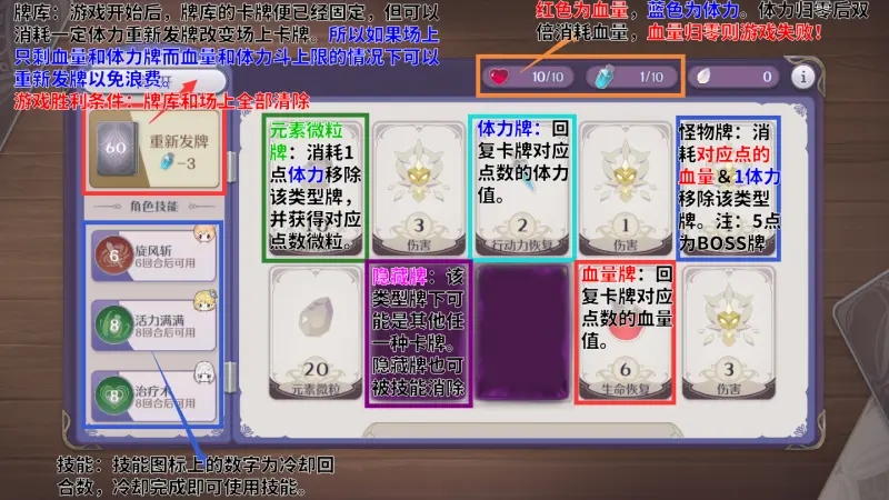 元素微粒/怪物牌无论数字标号多少,均消耗1点体力值。