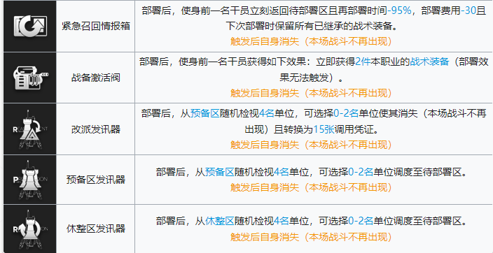 第五种道具,(休整区发讯器)从以及使用的卡池中检索4张干员,从中选择0-2名干员,将其置于部署区中(手牌)。