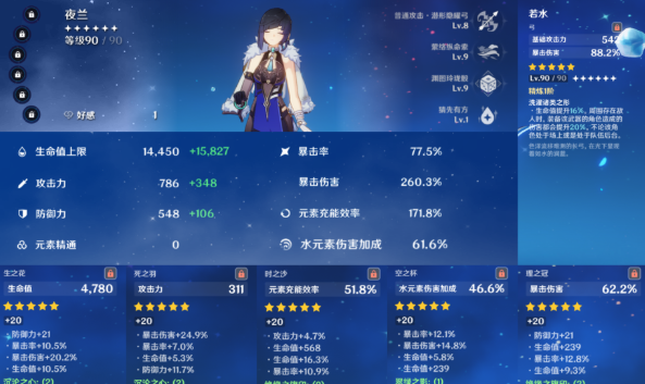 夜兰,通常作为后台副C,其提供的水元素可压胡桃和宵宫火,解锁六命可站场输出,否则站场收益较低;同时夜兰自身对大招需求较高,无大招期间比较平庸,因此充能词条也需要凹。
