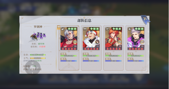 部队将领根据生命值的比例会进入健康,轻伤,重伤,死亡 四种状态,并且实力也随之下降,当处于死亡状态时,队伍无法再进行战斗。