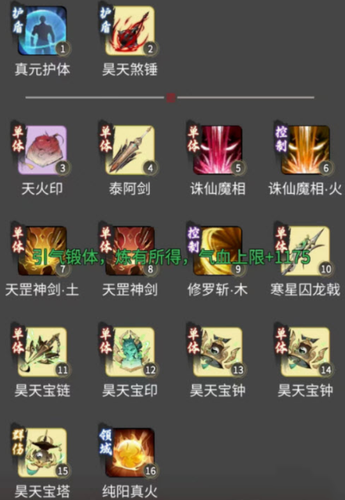 1、这是一套比较万能的搭配,具体可以看图,想要偷懒的仙友可以像这样选择护盾优先,毕竟有天罡神剑净化兜底,不愁解不了灯。而且真元护体开局放可以跟天罡神剑cd错开,应对灯时会更灵活。