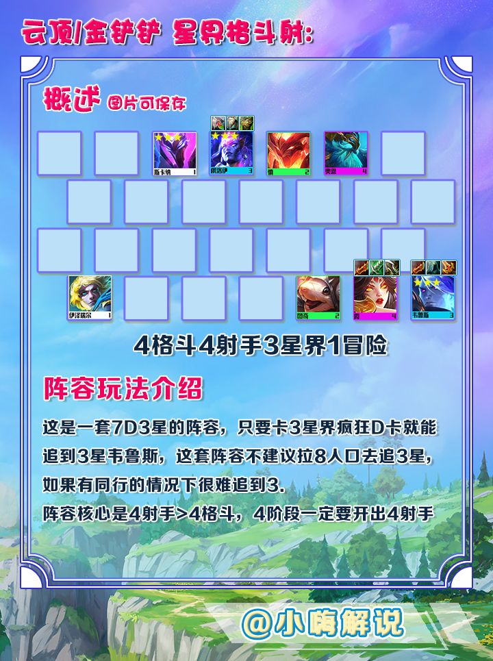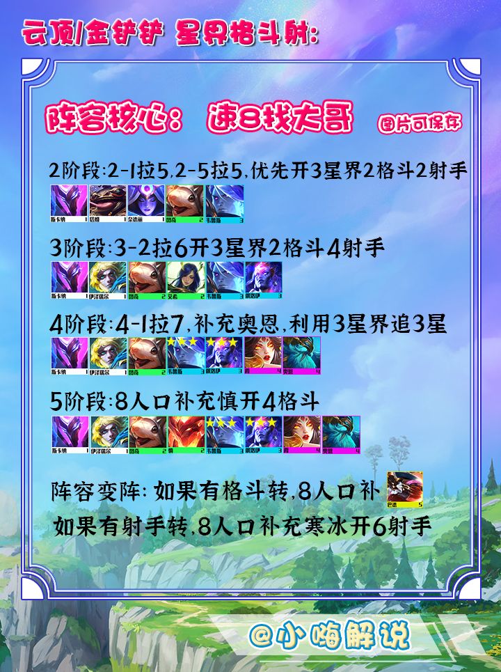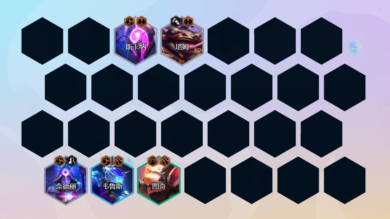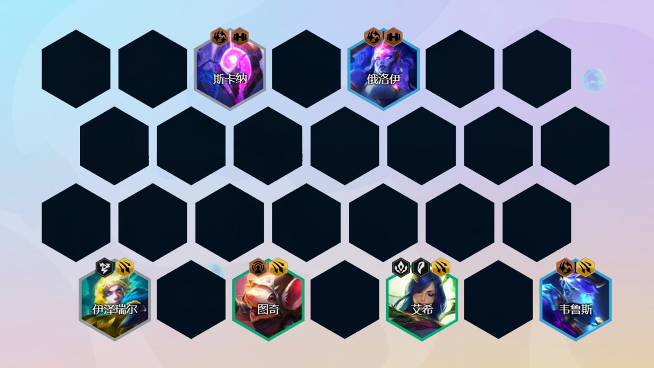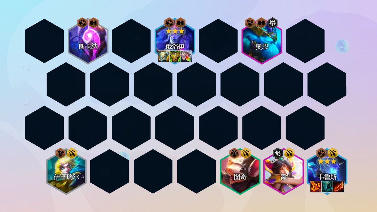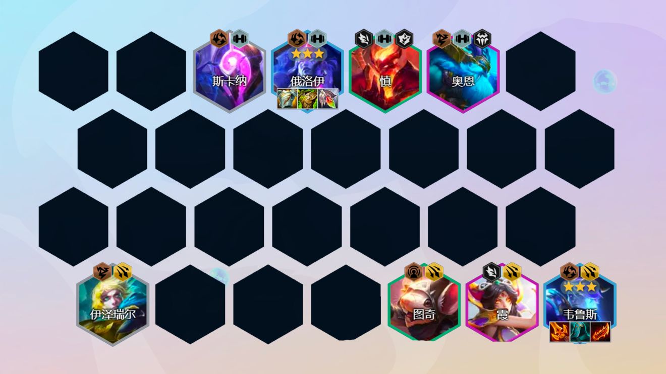 阵容组成:斯卡纳、伊泽瑞尔、图奇、韦鲁斯、俄洛伊、慎、奥恩、霞阵容羁绊:4格斗4射手3星界龙1冒险转职推荐:射手转格斗转