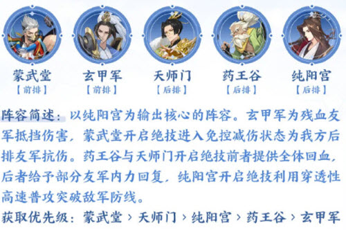 1、推荐阵容一:蒙武堂+玄甲军+天师门+药王谷+纯阳宫