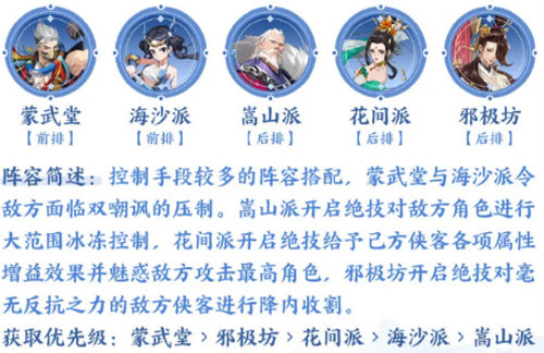 2、推荐阵容二:蒙武堂+海沙派+嵩山派+花间派+邪极坊