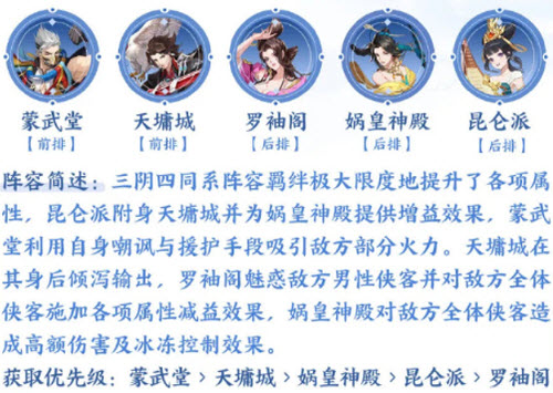 3、推荐阵容三:蒙武堂+天墉城+罗袖阁+娲皇神殿+昆仑派