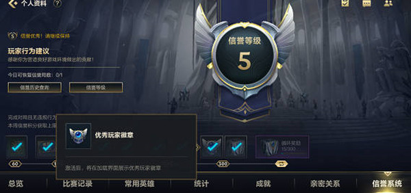 1、当我们的信誉积分达到三百分的时候就可以激活优秀玩家的徽章了,同时这个徽章会在玩家信誉积分等级下降之后自动消失的;