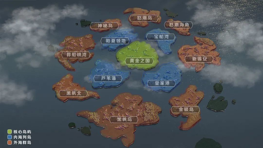 在新赛季地图——怒潮列岛大致分为三层:外层的外海群岛,中层的内海列岛,以及位于中心的核心岛,传说中的黄金之国便位于核心岛中。领主们会从「外海群岛」启航,通过收集“造船物资”,不断强化舰队。只有足够坚固的船只,才能穿过危险的海域,踏足核心区域,进入「内海列岛」,最终登陆「核心岛」——探索黄金之国。