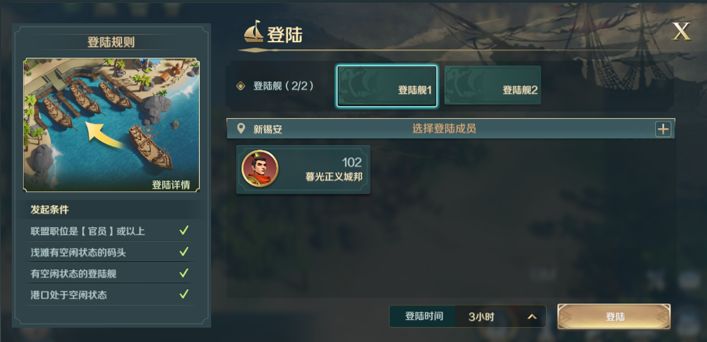 ② 在正式登陆前,除了需要达到前置条件外,还需要一定的时间准备,联盟官员设置参与登陆的成员和登陆时间后,便可召集联盟成员参与登陆;