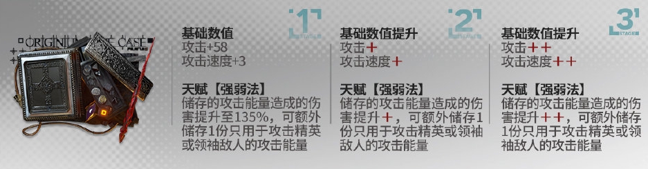 储存的攻击能量造成的伤害提升+,可额外储存1份只用于攻击精英或领袖敌人的攻击能量